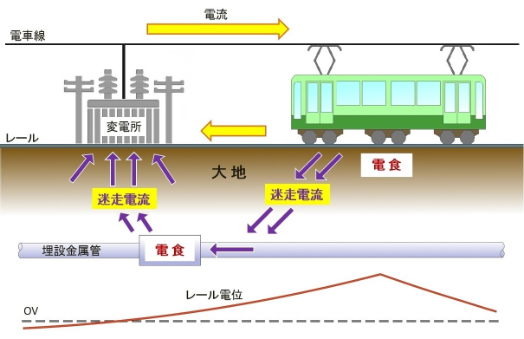 電気鉄道のレールから大地への漏れ電流により、地中の金属配管等が腐食することがあります。