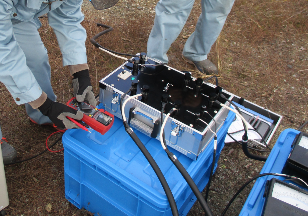 大規模接地体(構造体接地・メッシュ接地・環状埋設地線)では接地極が広大な範囲となるため接地抵抗が非常に低く、誘導の影響を受けやすいことから、測定時には電極に10~20アンペア程度の電流を流す必要があります。そのため、電流を流す電線や電極に人を触れさせない等の安全対策を十分に行う必要があります。