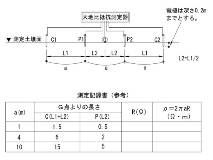 大地抵抗率の測定方法は三電極法及びウェンナ―の四電極法が推奨されています。下記にて簡単にご紹介いたします。
